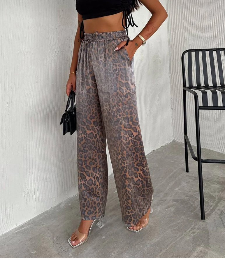 Kadınlar için bol kesim, ipeksi dokulu, kahverengi leopar desenli kemerli pantolon. Midi boyda, günlük sokak stiline uygun