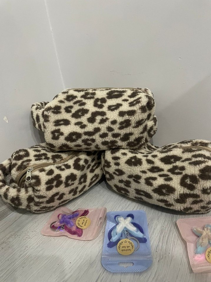 Leopar desenli, yumuşak tüylü dokusuyla rahat kadın makyaj çantası, günlük kullanım için bohem tarzda. -----âdet fiyatı ------