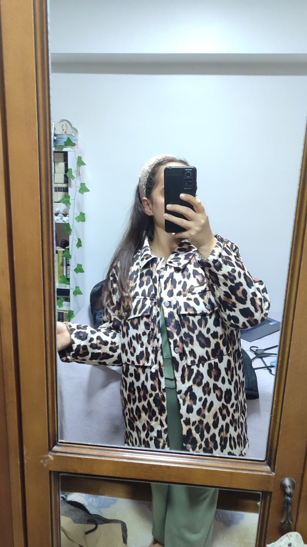 Kadınlar için leopar desenli, bol kesim, yakalı midi ceket. Açık kahverengi tonlarında, kürk detaylı, sentetik kumaştan üretilmiştir. Sokak modasına uygun ve günlük kullanıma idealdir.
