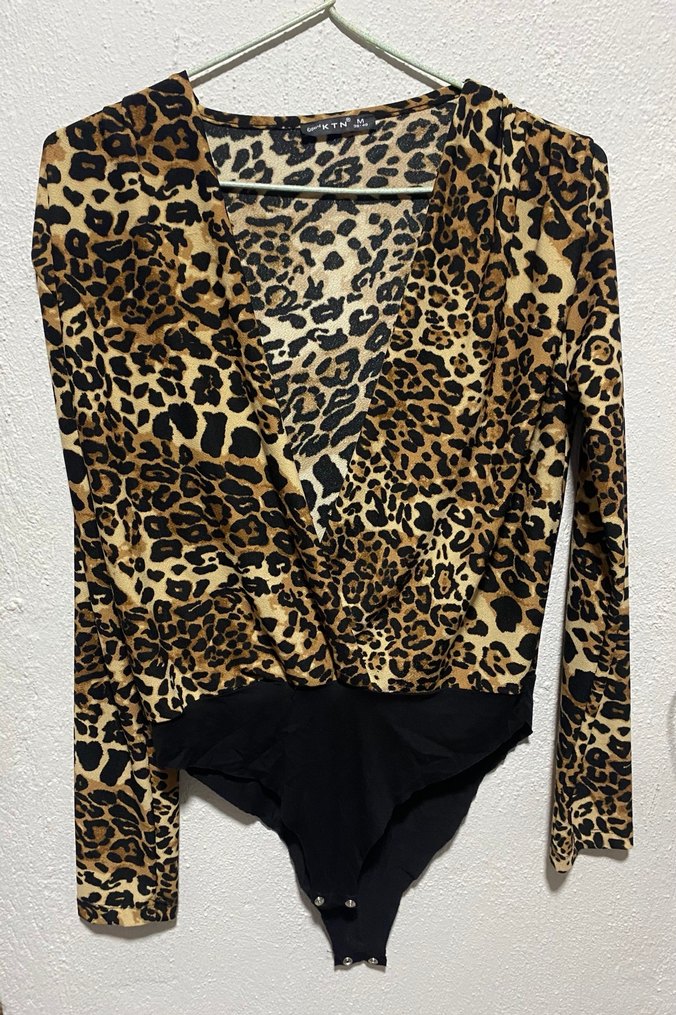 Uzun kollu, V yakalı ve leopar desenli kahverengi kadın bluz, yumuşak sentetik kumaştan ve kürk detaylı. Günlük sokak stili için uygun midi uzunlukta.