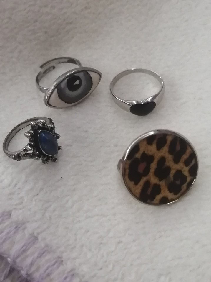 Dört adet kadın yüzük seti; leopar desenli kahverengi, boncuklu mavi taşlı, siyah kalp ve göz figürlü yüzükler. Günlük kullanıma uygun koyu goth tarzda.