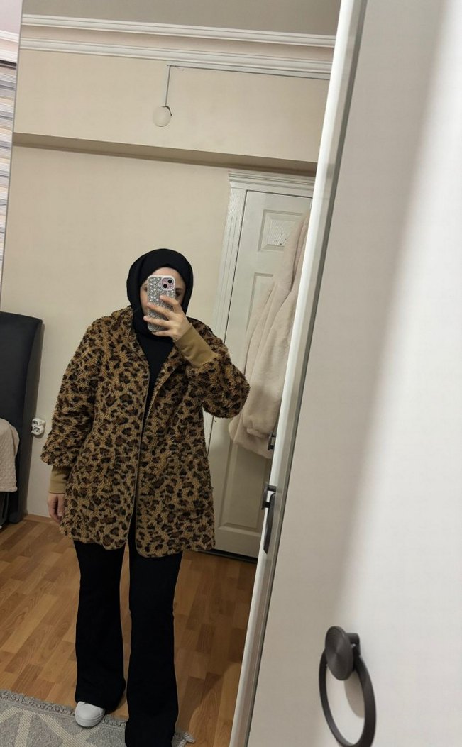 Bol kesim, midi uzunlukta kahverengi leopar desenli kadın kaban. Uzun kollu, kapüşonlu ve yumuşak, sıcak kumaşlı, kürk detaylı rahat sokak stili.