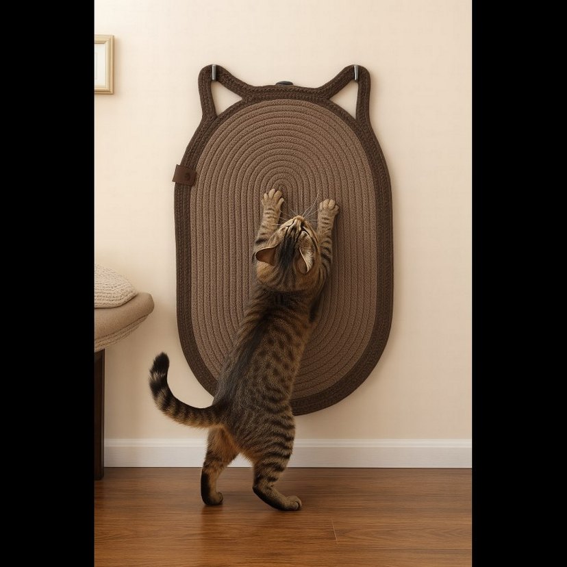 Kahverengi, leopar desenli ve yarık detaylı kedi tırmalama matı, kulak şeklinde tasarımı ile kedilerin tırmalaması için uygundur.