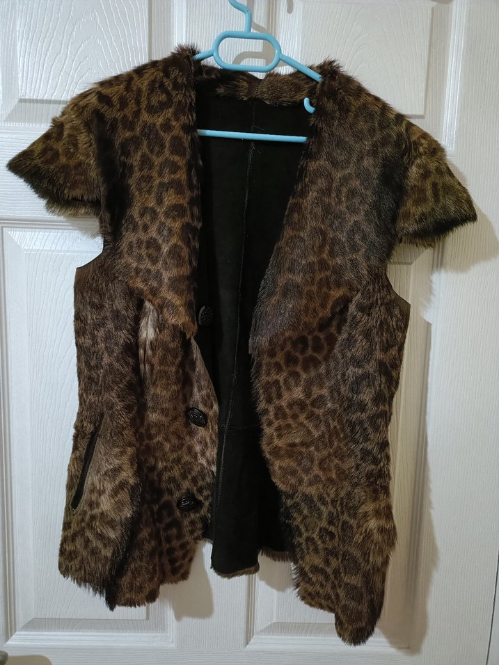 Leopar Desenli Kahverengi Kürklü Süet Yelek