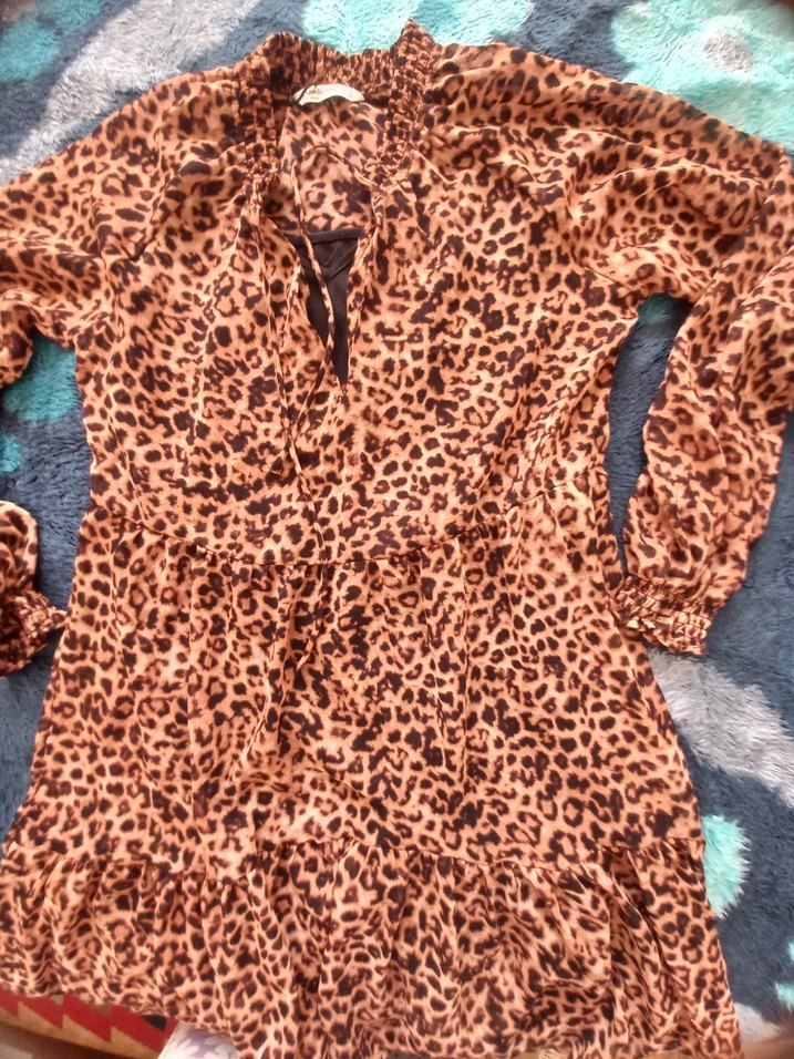 Kahverengi leopar desenli, uzun kollu, V yaka ve bol kesim midi elbise. asrar detaylı, rahat ve bohem tarzda günlük kullanım için uygun.