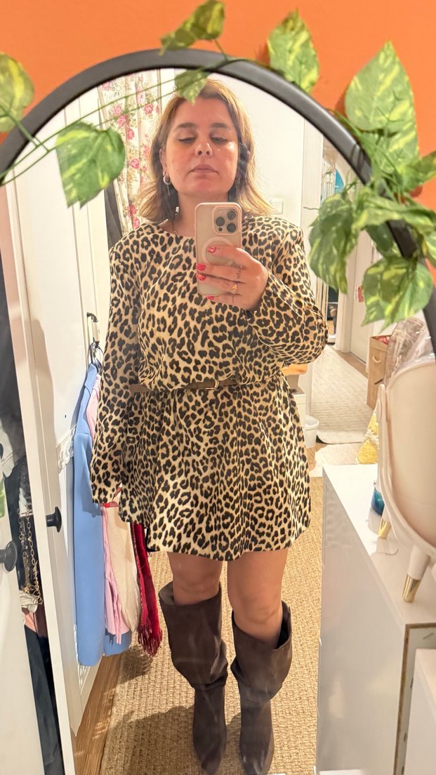 Kahverengi midi elbise, bol kesim, uzun kollu.Leopar desenli, gündelik sokak stiline uygun. Hiç giyilmedi. Hediye geldi