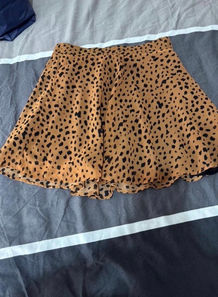 Kahverengi, leopar desenli mini etek, bol kesim ve fırfırlı detaylara sahip. Yumuşak sentetik kumaştan üretilmiştir, rahat ve bohem tarzda dış mekan kullanımı için uygun .