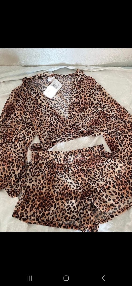 Kahverengi leopar desenli, uzun kollu, bol kesim kadın sabahlık ve şort takımı, rahat ve sokak modasına uygun.