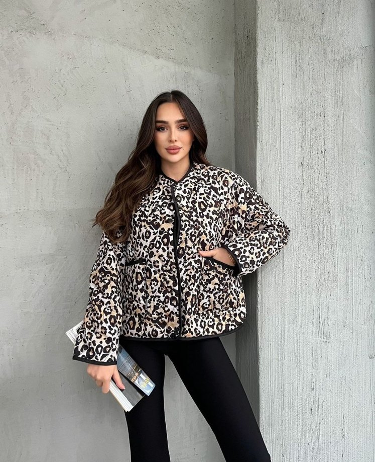 Kahverengi leopar desenli, peluş kumaştan kısa, bol kesim kadın ceket. Uzun kollu ve yuvarlak yaka detaylarına sahip, rahat sokak stiline uygun.
