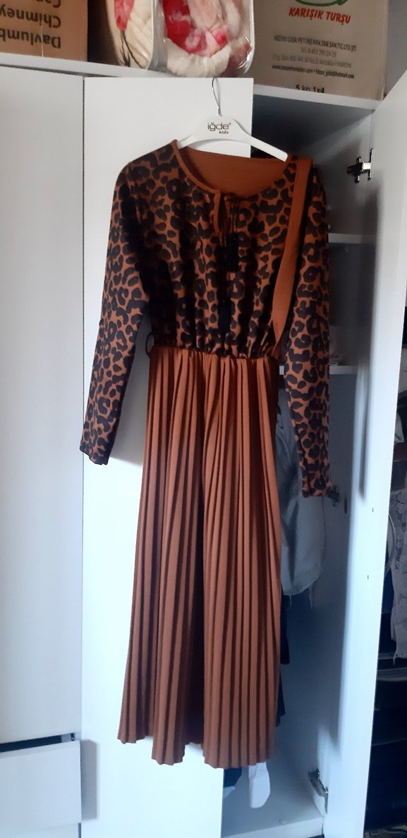Kahverengi, pilili uzun elbise, üst kısmında leopar desenli, yuvarlak yaka ve uzun kollu, sentetik kumaştan, bol kesim. sadece özel günde 2 defa giyildi hiç bir defosu yoktur kot ceketle kombindir dileyen ikisini de ekler böylede tek kargo ücreti olur
