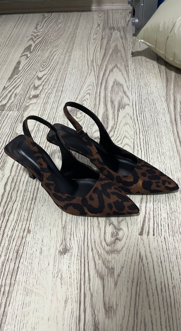 Kahverengi süet malzemeden yapılmış, leopar desenli ve kürk detaylı stiletto. Arkası açık, sivri burunlu tasarım cesur bir stil sunar.
