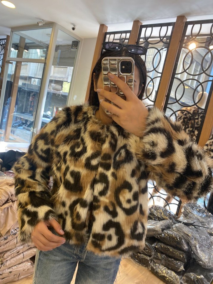 Leopar Desenli Kahverengi Suni Kürk Ceket