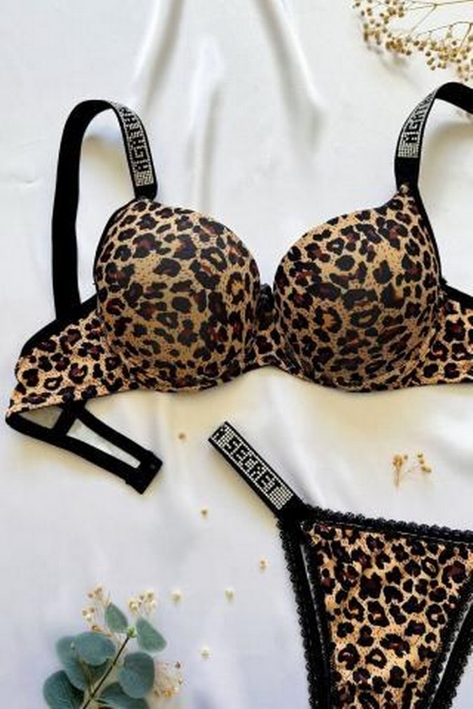 Koyu kahverengi leopar desenli, taşlı siyah ayarlanabilir askılı sütyen ve külot