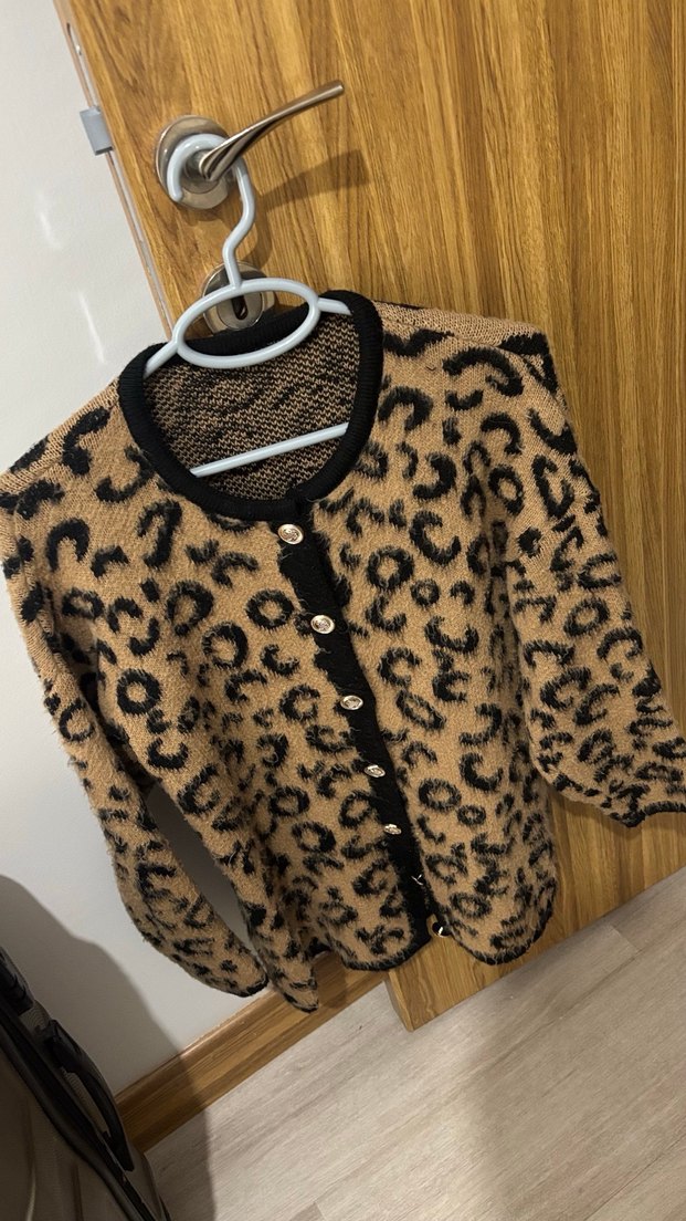 Kahverengi leopar desenli triko hırka, uzun kollu ve yuvarlak yaka. Bol kesim ve midi boyda, bohem tarz için uygun.
