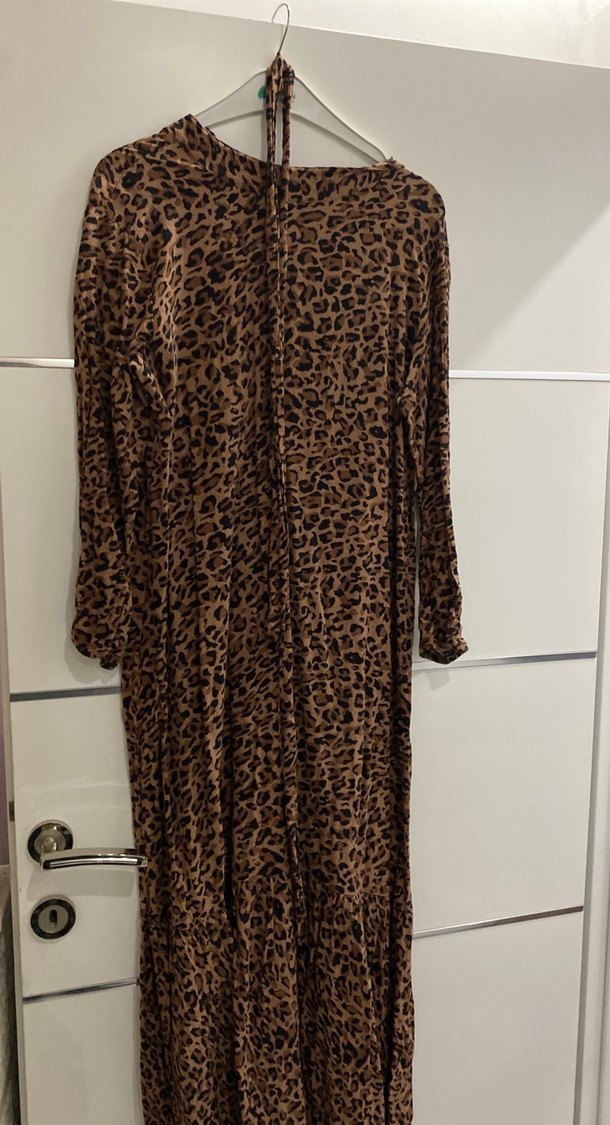 Kahverengi leopar desenli, uzun ve bol kesim elbise. Drapeli detaylar ve V yaka ile rahat, sentetik dokulu kumaştan yapılmıştır. Uzun kollu, bohem tarzda günlük kullanıma uygun.