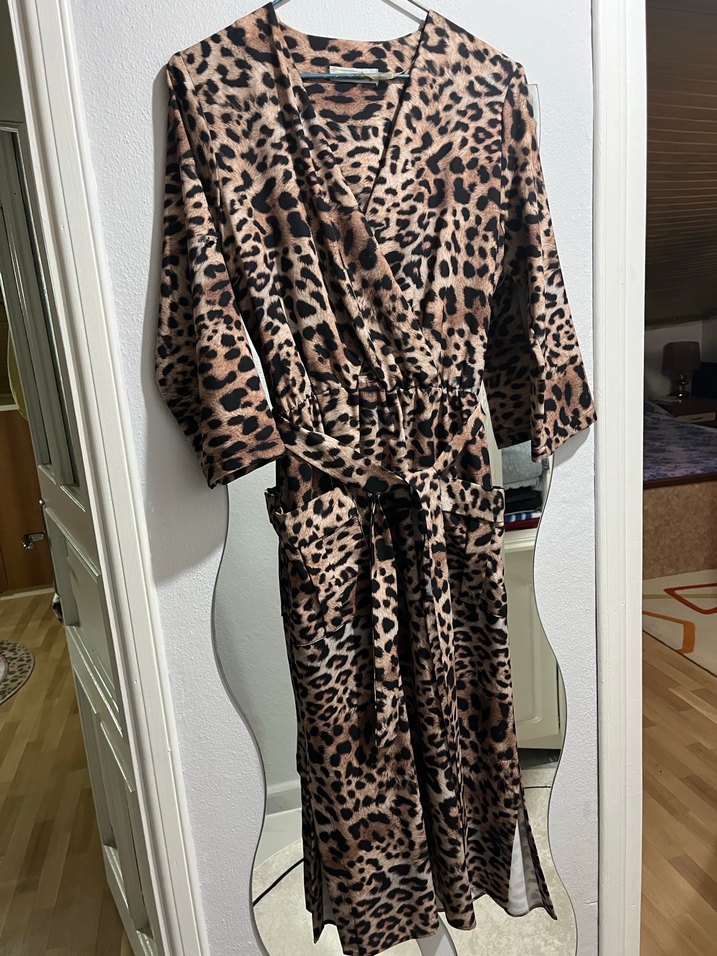 Leopar desenli, kahverengi uzun elbise, bol kesim ve kemerli. Uzun kollu ve V yaka, yumuşak sentetik kumaştan, rahat sokak stili için uygun.