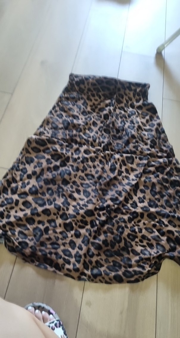 Sentetik kumaştan, gevşek kesim ve drapeli kahverengi leopar desenli uzun etek. Açık hava için uygundur.