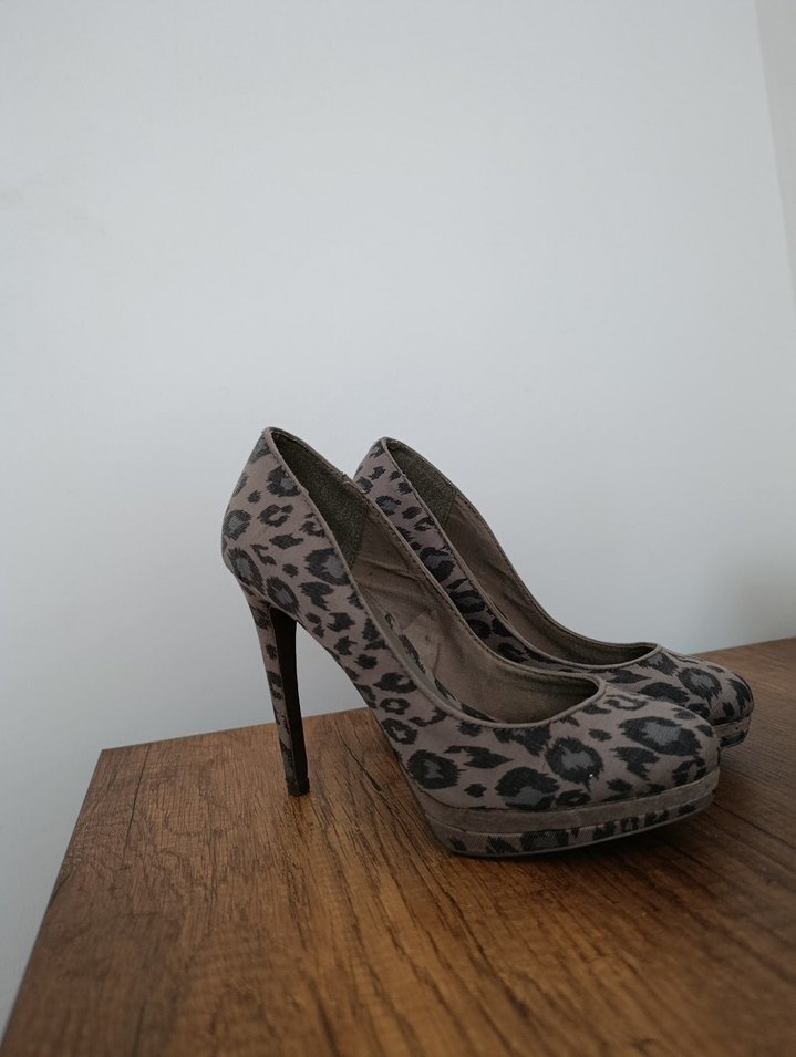 Kahverengi taban üzerinde gri leopar desenli, tokalı yüksek topuklu stiletto. Kauçuk malzemeden üretilmiş, modern sokak stiline ve romantik buluşmalara uygun.