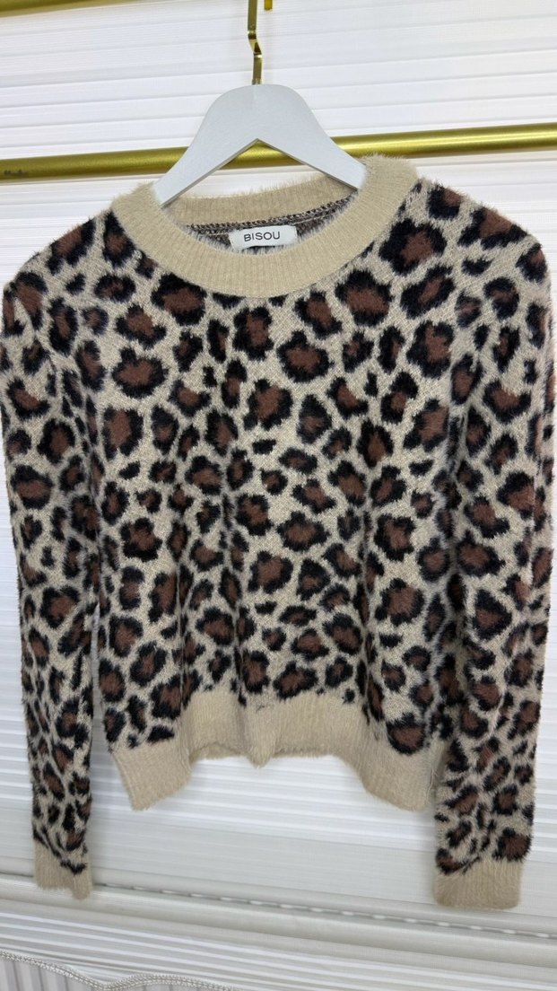 Bu rahat kadın kazağı, kahverengi tonlarda örme leopar desenine sahiptir. Yuvarlak yaka ve uzun kolludur, bol kesim ve normal uzunluktadır.