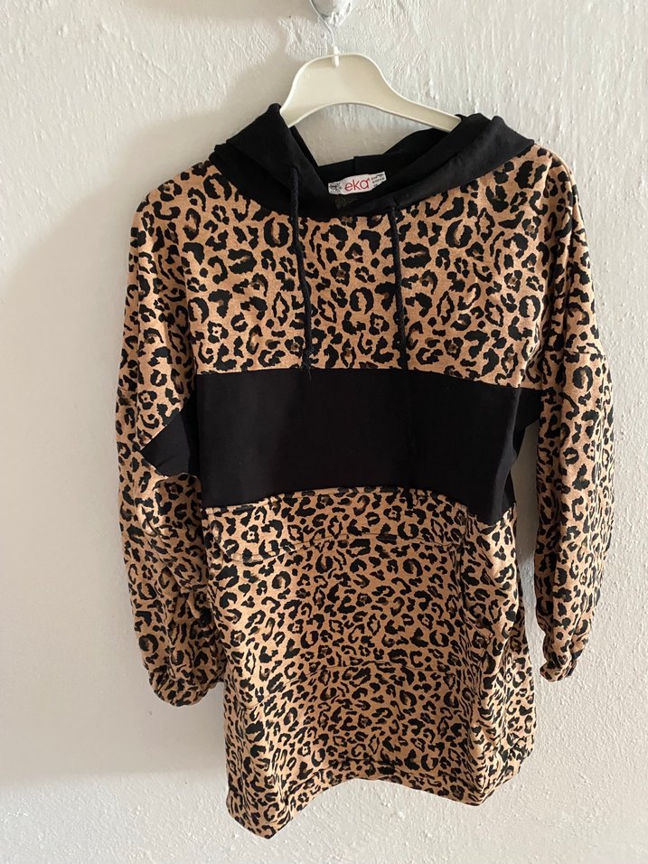 Kadınlar için leopar desenli, kapüşonlu, bol kesim uzun kollu sweatshirt. Sentetik kumaştan, midi boyda, rahat sokak stili için uygun.