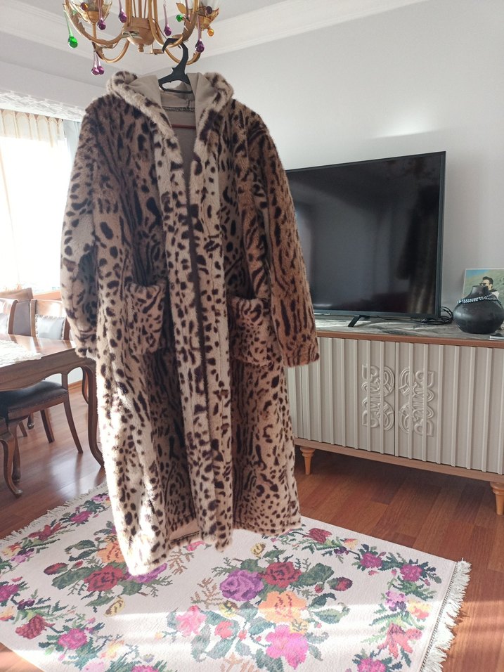 Leopar desenli, kapüşonlu, uzun ve bol kesim kadın peluş mont. Yumuşak fleece kumaştan, kürk detaylı, rahat ve bohem tarzda. Günlük kullanıma uygun.