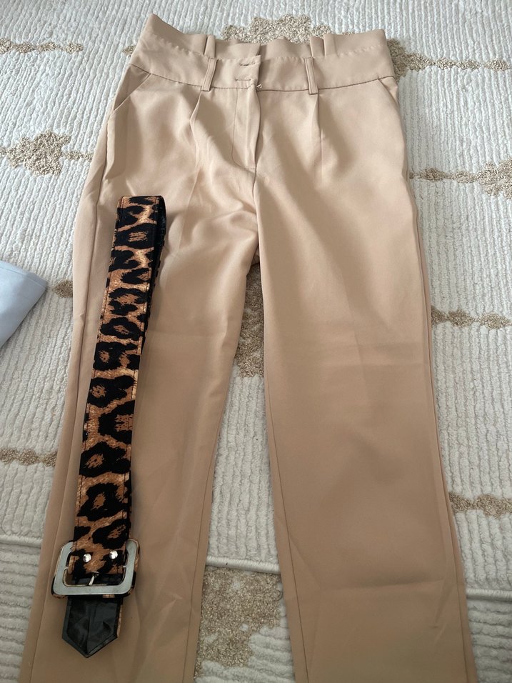 Düzenli kesim, uzun boy bej kumaş pantolon, parlak leopar desenli kemerle tamamlanmıştır. Günlük sokak stiline uygundur. 38 beden