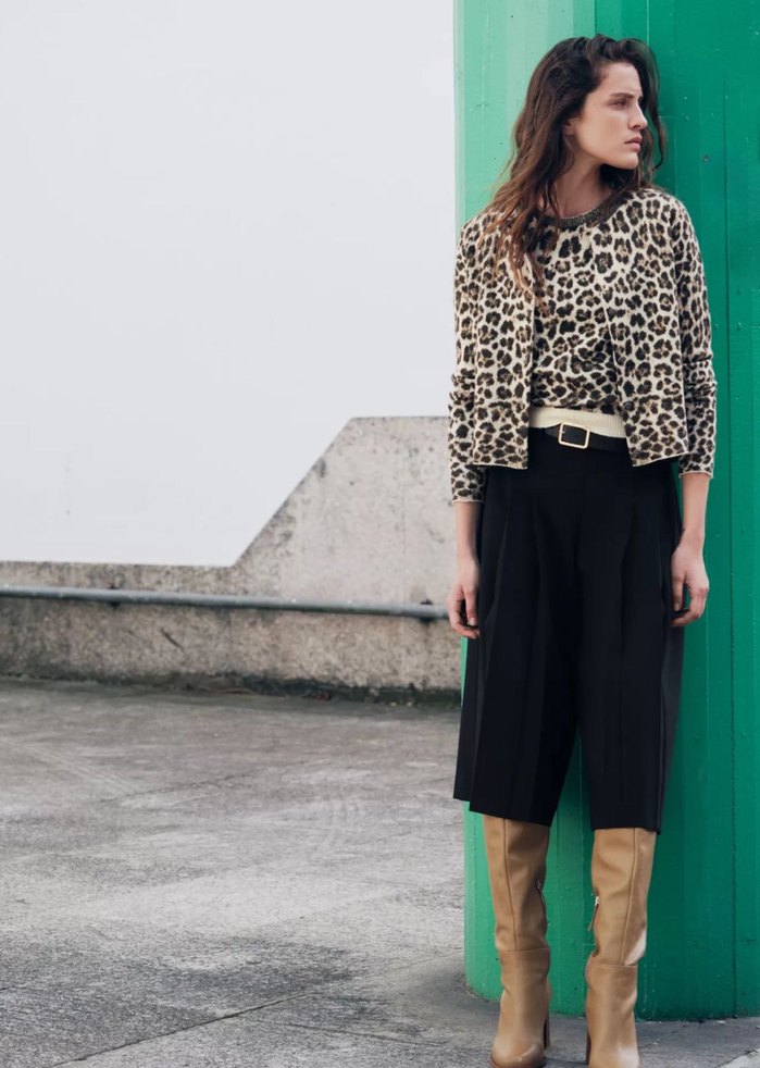Bu kadın deri ceket, loose fit ve kısa boyda, kemerli bel detayına sahiptir. Açık camel renkte leopar desenli, uzun kollu ve balıkçı yaka tasarımdadır.