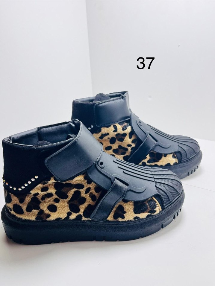 Leopar desenli, kemerli, platform topuklu kadın spor ayakkabısı. Sokak stiline uygun, koyu kahverengi tonlarda. Başka modellerde mevcuttur
