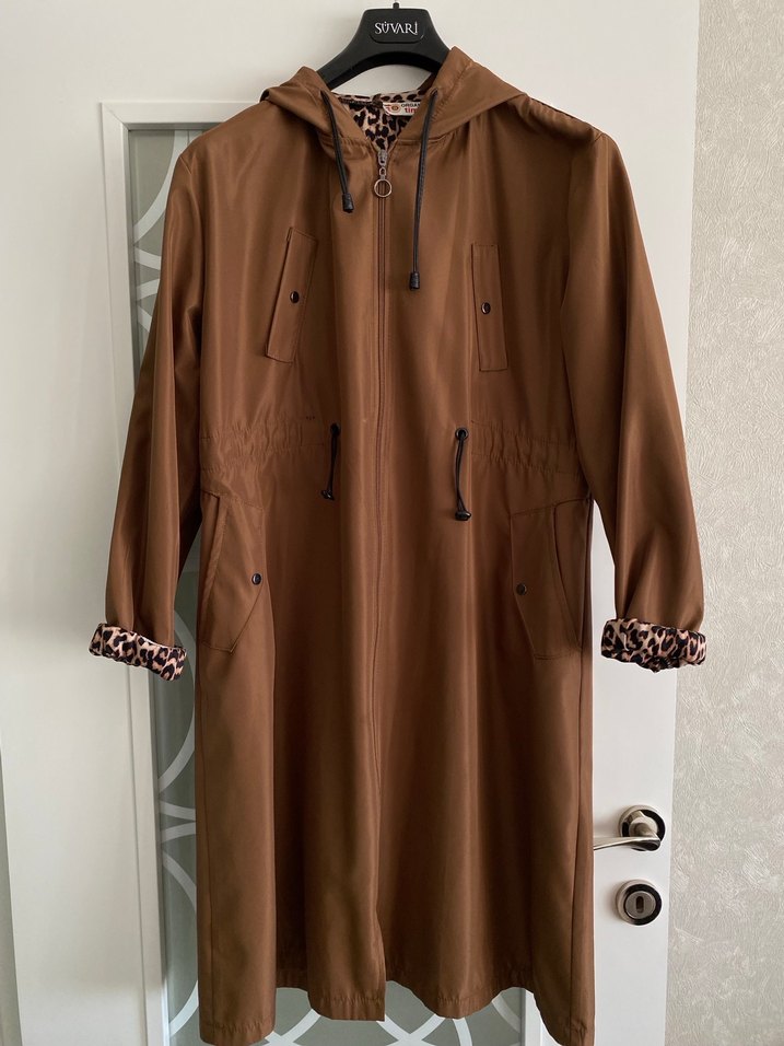 Kadınlar için uzun kahverengi yağmurluk, bol kesim, uzun kollu ve yakası kesik detaylıdır. Kemer ve leopar desenli astarıyla rahat sokak stili sunar. 1 2 kere kullanıldı tertemiz
