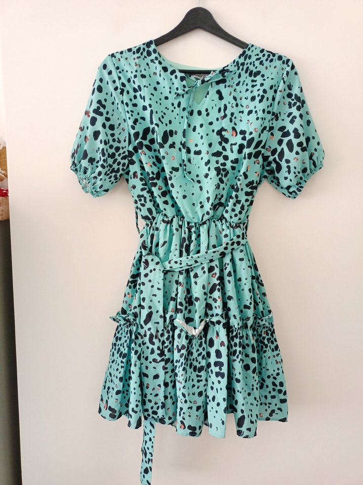 Turkuaz renkli, leopar desenli, kısa kollu, V yakalı, lastik bel, bol kesim mini elbise. Yumuşak sentetik kumaştan bohem tarzda. Boy 85 cm