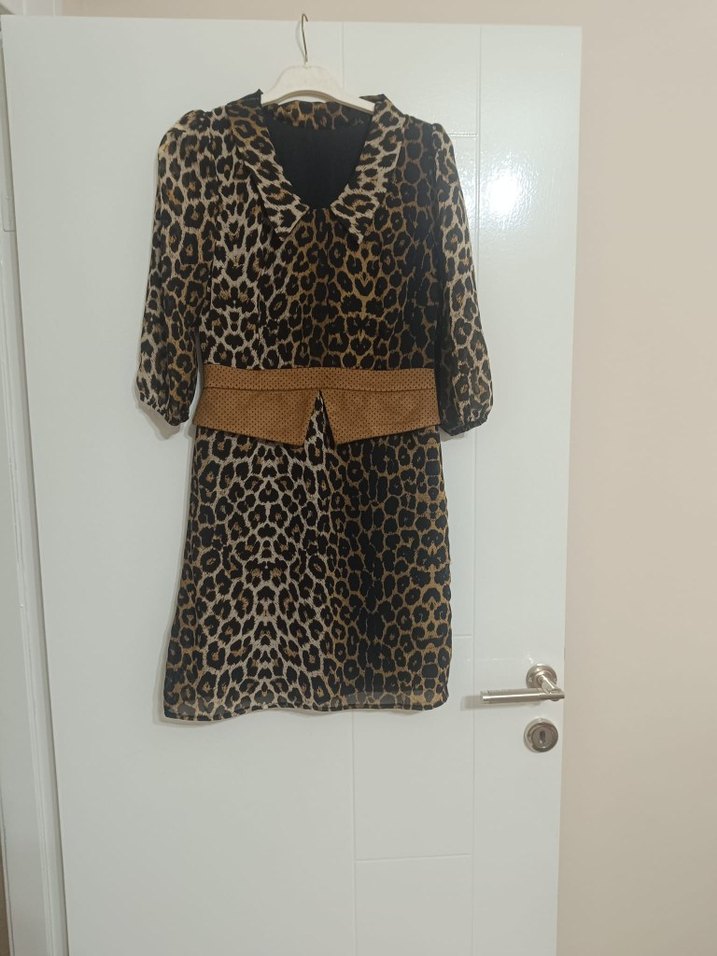 Leopar Desenli Kemerli Mini Elbise