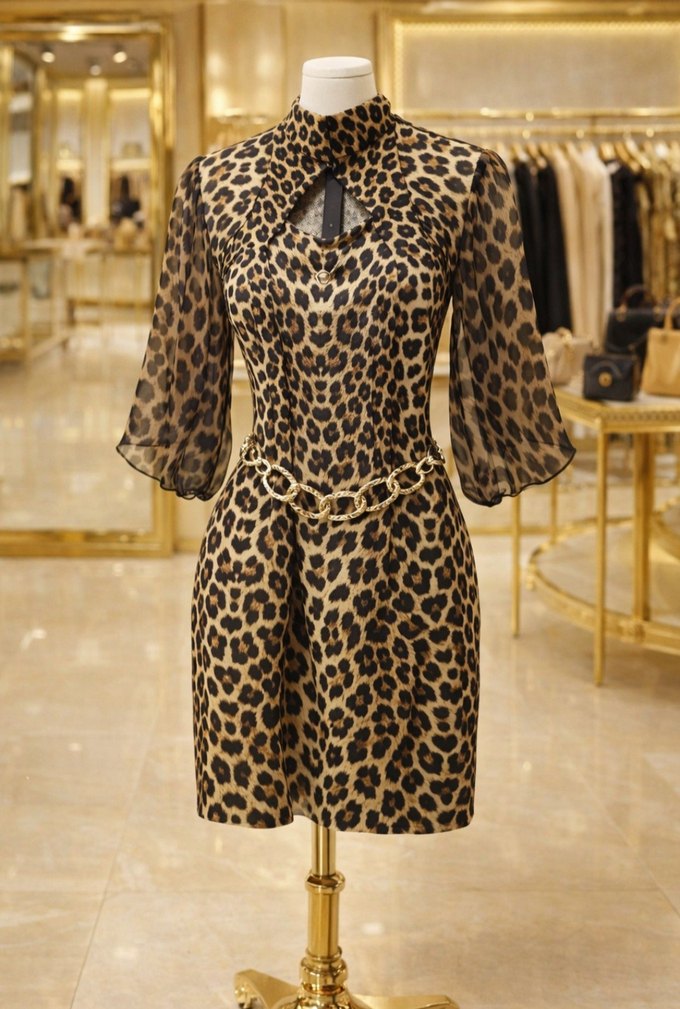 Kahverengi leopar desenli mini elbise, yüksek yaka ve askılı kollara sahiptir. Sentetik kumaştan, kemerli ve vücuda oturan kesimdir, ofis için uygundur. tül kol detayı ve şık kemerli haliyle gòz kamaştırıcı olacaksınız #elbise #minielbise #leopar #abiye #ofiselbisesi
