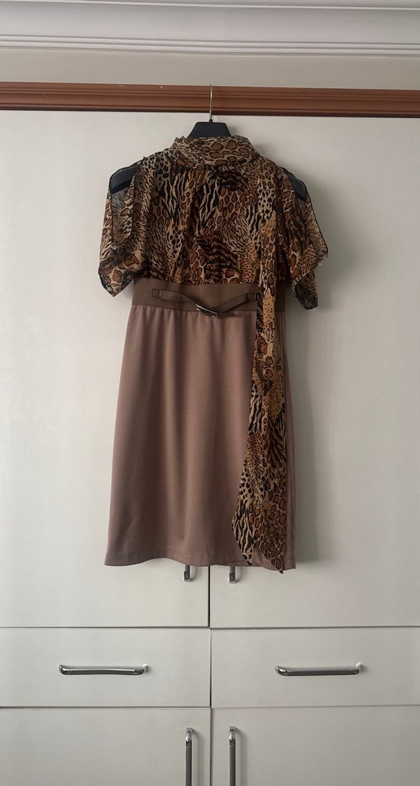 Leopar desenli üst kısmı ve düz kahverengi etek kısmı olan, kemerli ve askısız kısa elbise. Etek kısmı penye kumaş, üst kısmı şifon kumaş bol kesim ve bohem tarzda günlük kullanım için uygun.