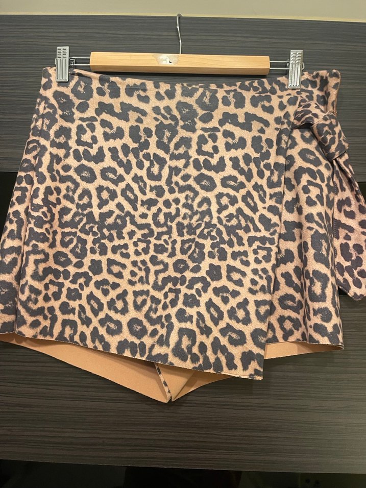 Kemer detaylı, leopar desenli kahverengi mini şort etek, dar kesimiyle sokak stiline uygun şık bir parça.