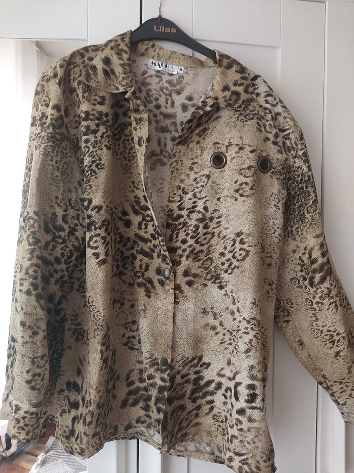 Düğmeli, saten kumaştan, leopar desenli, bol kesim, uzun kollu, yakası kesik detaylı vintage bohem tarz gömlek.