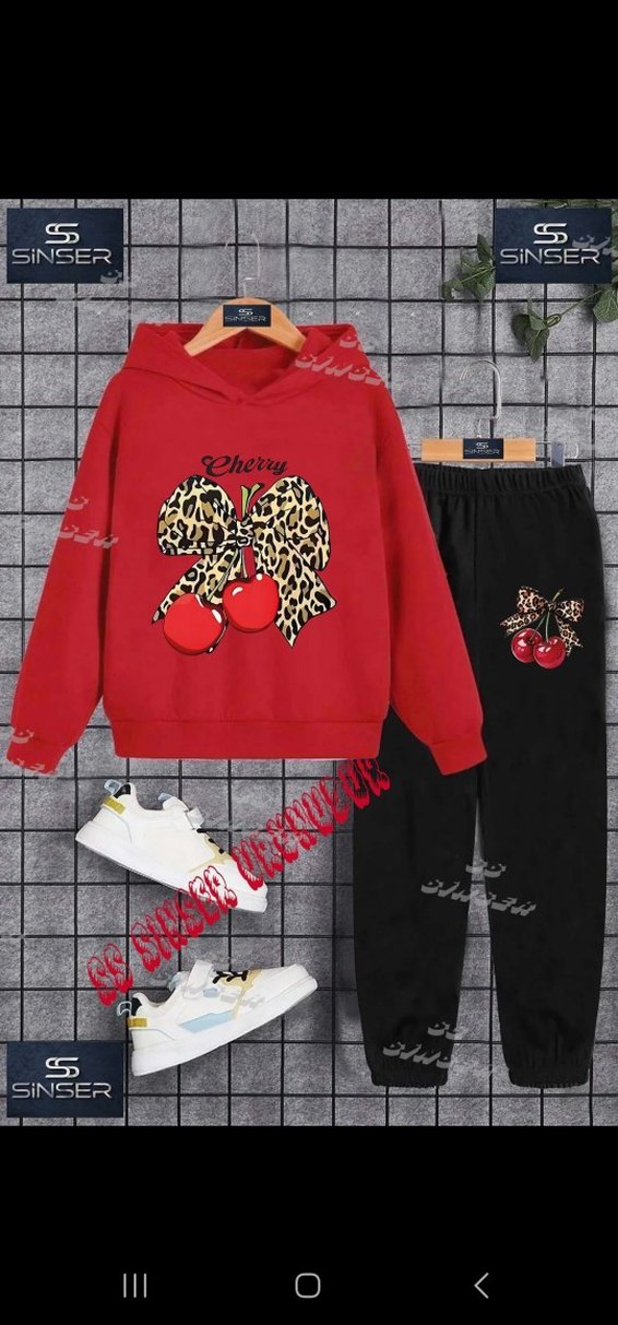 Kırmızı, leopar desenli fiyonklu, pul işlemeli kiraz detaylı, bol kesim sweatshirt ve siyah eşofmandan oluşan, yumuşak ve sıcak kumaşlı erkek sokak stili takım.