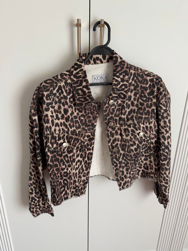 leopar desenli, kısa ve fitted kesim kadın ceket. Uzun kollu ve yakası notched lapel stilde, günlük kullanıma uygun.