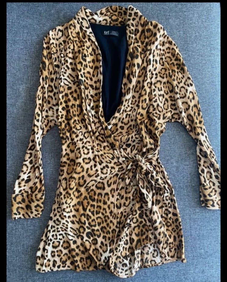 Kısa boylu, uzun kollu ve leopar desenli kahverengi, Paris sokak modasına uygun kadın elbisesi.