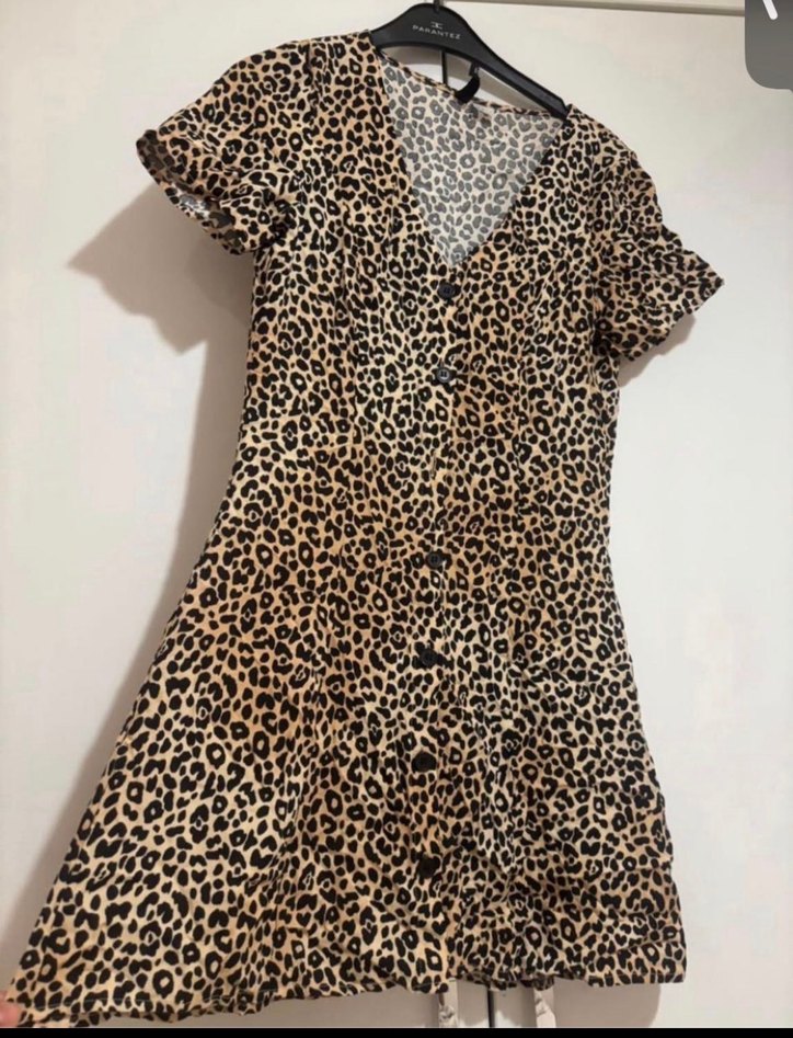 Leopar desenli, kısa kollu ve V yaka olan bu mini elbise düğmeli detaylara sahiptir ve sentetik yumuşak kumaştandır. Günlük şık sokak stili için uygundur.
