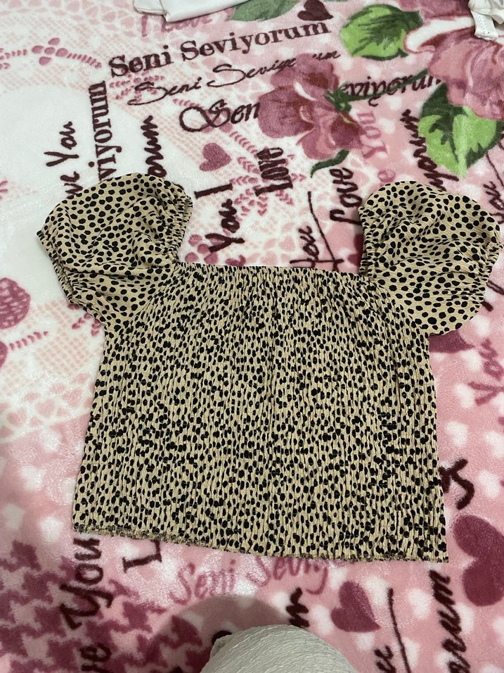 Yumuşak sentetik kumaştan yapılmış, bol kesim, kısa boylu bluz; fırfırlı kısa kollu ve tekne yaka. Pastel kahverengi leopar desenli, "Seni Seviyorum" yazılı, günlük sokak giyimine uygun.