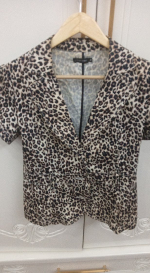 Kısa kollu, düğmeli, V yakalı, leopar desenli, midi uzunlukta, sentetik kumaştan yapılmış, fitted kesimli kadın blazer. Ofis ve günlük kullanıma uygun.