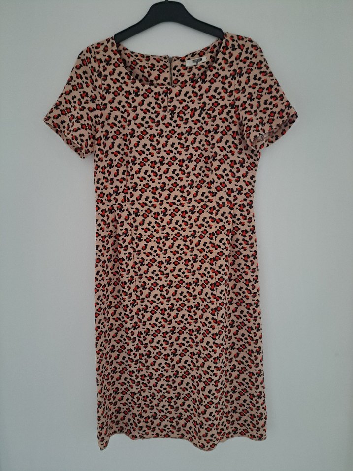 Kısa kollu, bisiklet yaka, bol kesim kahverengi midi elbise, renkli leopar desenli ve drapeli, bohem ve sokak stili için uygun. Mrka temsili