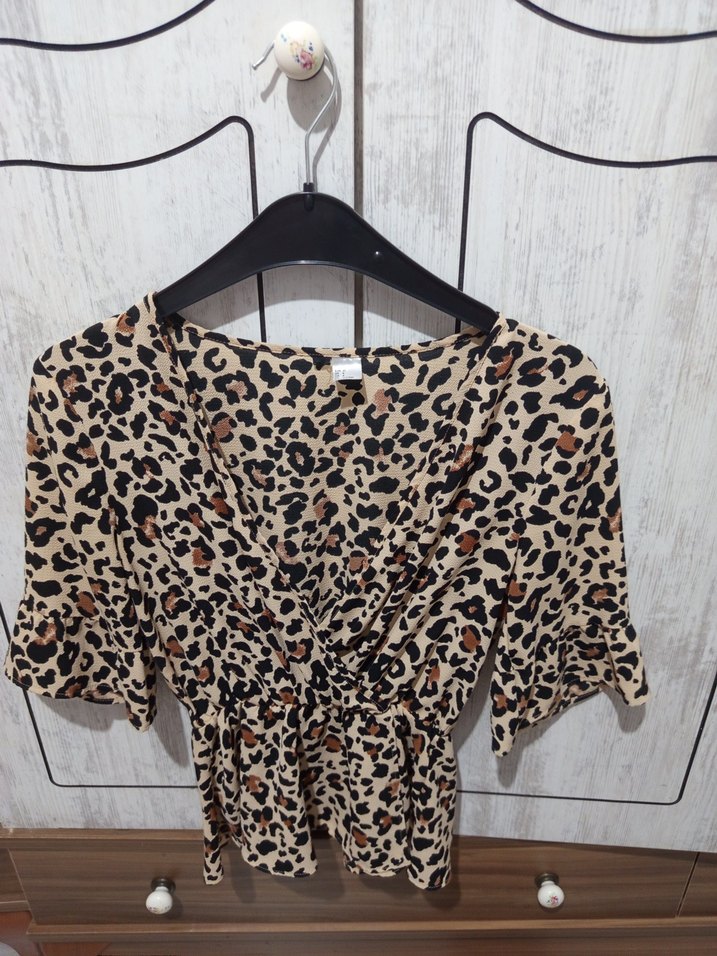 Koyu kahverengi leopar desenli, V yaka ve kısa kollu, kemerli, bol kesim, sentetik kumaştan bluz. Trendy ve rahat bir tarz sunar.