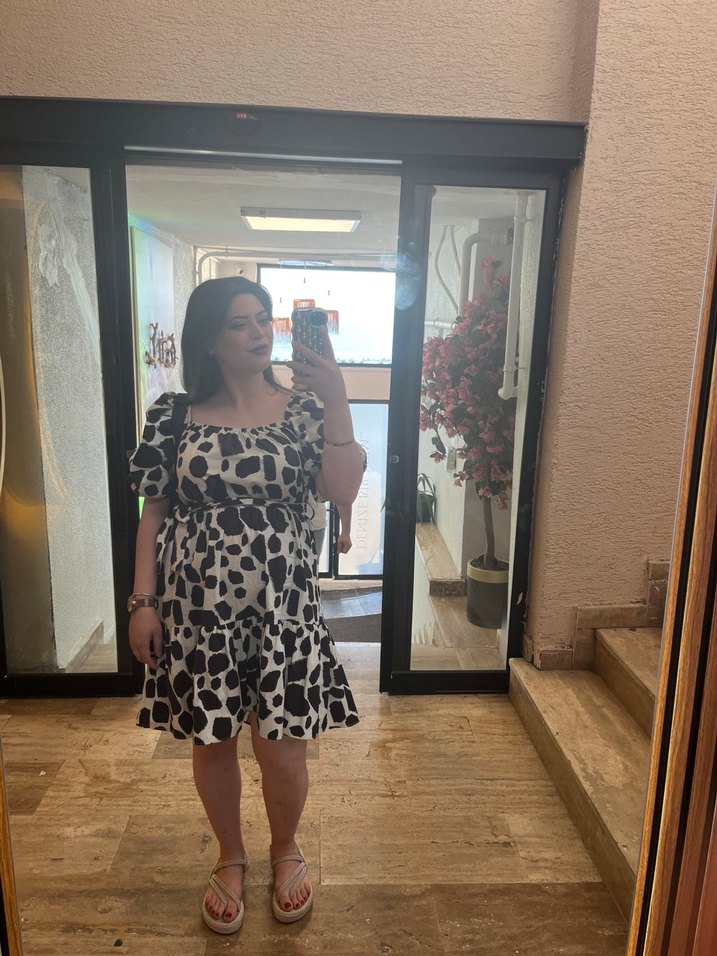 Koyu kahverengi leopar desenli, kısa boy, bol kesim, V yakalı ve puf kısa kollu kadın elbisesi. Bel lastikli kalıp rahat 42 bedene kadar olur