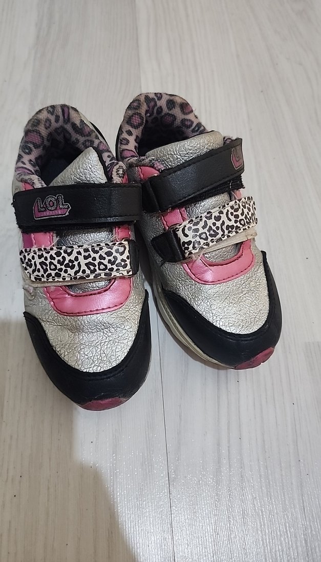 Leopar desenli, gri ve pembe renklerde kız çocuk spor ayakkabısı. Cırt cırtlı ve kauçuk tabanlı, sokak modasına uygun rock punk tarzında.