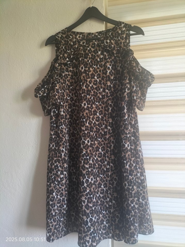 Leopar desenli, kolsuz, straplez yakalı ve dökümlü detaylı gevşek kesim midi elbise, yumuşak sentetik kumaştan yapılmıştır. astarlı