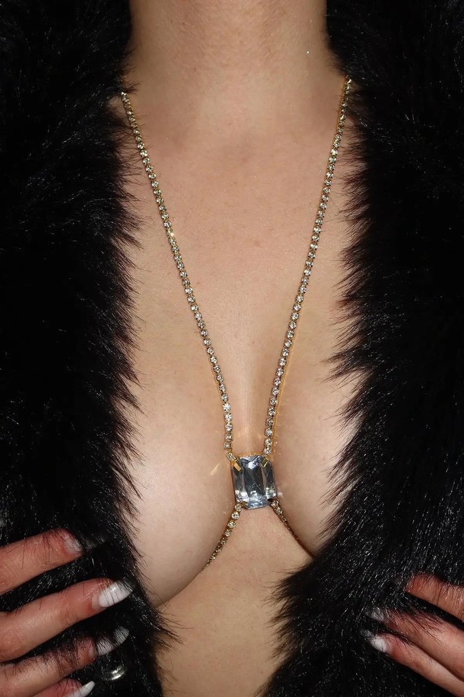 Leopar desenli, kürklü ve parlak taşlı altın renkli vücut zinciri. Cesur, gösterişli gotik tarzlar için partiye uygun. ✨