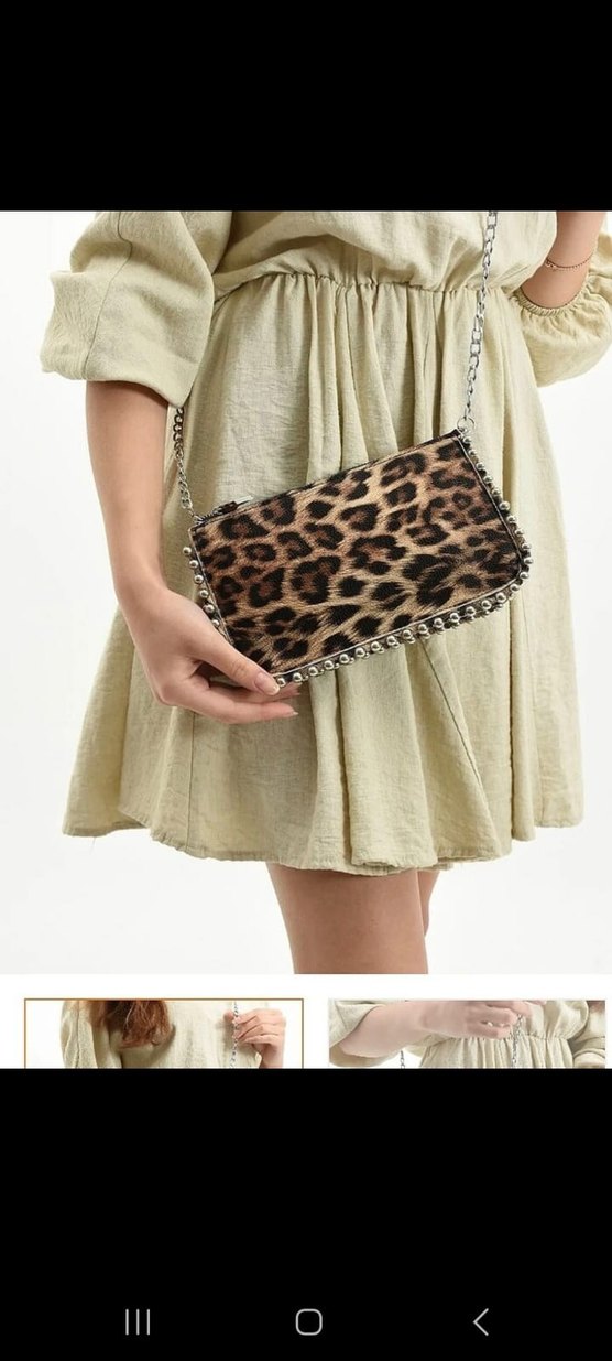 Yumuşak sentetik kumaştan yapılmış, leopar desenli ve kürklü bej çapraz çanta. Zincir askı ve perçin detaylarına sahip, günlük kullanım için uygundur.