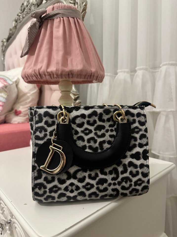 Kadın çantası, gri leopar desenli ve kürklü detaylıdır. Siyah saplı, sentetik kumaştan yapılmış, klasik ve çağdaş tarzı birleştirir.