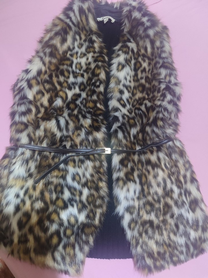 Leopar desenli, kürklü kadın yelek. Dar kesim, yakalı ve askılı kollu. Sentetik kumaştan üretilmiş, midi boyda ve koyu kahverengi. Dış mekan kullanımı için uygun.